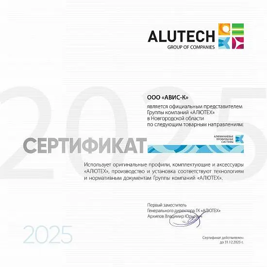 Компания «АВИС», основанная в 2011 году на строительном рынке Новгородской области, имеет заслуженную репутацию надежного партнера. В 2018 году, сохраняя традиции и активно развивая новые направления, образовалась компания «АВИС-КОНСТРУКЦИЯ» (ООО «АВИС-К»), которая получила статус официального представителя ООО «АЛЮТЕХ» в Великом Новгороде и Новгородской области.